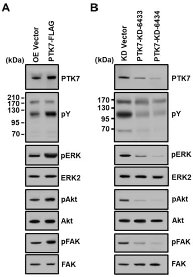The following antibodies were used: anti-phospho-ERK (sc-7383) and anti-FAK (sc-557), obtained from Santa Cruz Biotechnology (Santa Cruz, CA, USA); anti-phospho-Akt (Ser473) (4060s) and anti-Akt (9272s), obtained from Cell Signaling Technology (Danvers, MA, USA); anti-phospho-tyrosine (clone 4G10) (05-321) and anti-phospho-FAK (Tyr397) (abt135), obtained from Merck Millipore (Burlington, MA, USA); anti-ERK2 (bms-52068R), obtained from Bioss (Boston, MA, USA); anti-FLAG-M2 antibody (F1804), obtained from Sigma-Aldrich; anti-Ki-67 (ab15580), obtained from Abcam (Cambridge, UK); anti-GAPDH (abc2003), obtained from AbClone (Seoul, Korea); and horseradish peroxidase-conjugated goat anti-mouse IgG (K0211589) and rabbit IgG (K0211708), obtained from KOMA Biotech (Seoul, Korea). The generation of anti-PTK7 anti-serum was described previously [].