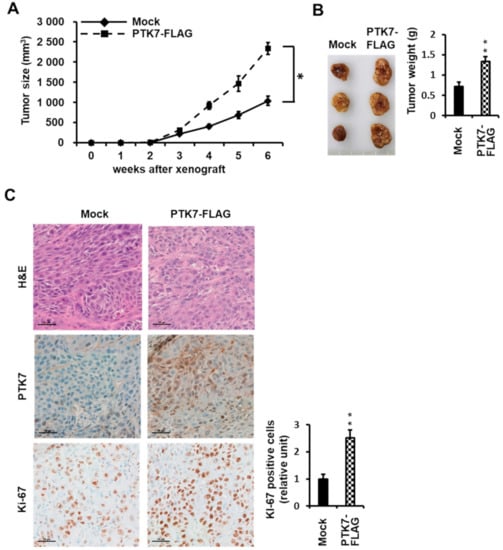 Effect of PTK7 overexpression on tumor growth in xenograft mice. KYSE-30 cells with mock-transfected or overexpressing PTK7-FLAG were injected subcutaneously into the dorsal regions of mice. (A) Tumor volumes were monitored once per week for 6 weeks. (B) Images of tumors from mice at 6 weeks after injection (left) and the corresponding weights (right) are shown. Each bar represents the mean ± SD of the three mice. * p < 0.05, ** p < 0.01 vs. mock-transfected cells. (C) Representative images of histologic and immunohistochemical (PTK7 and Ki-67) analysis of tumors are shown in the indicated groups of mice. Scale bar represents 50 μm.