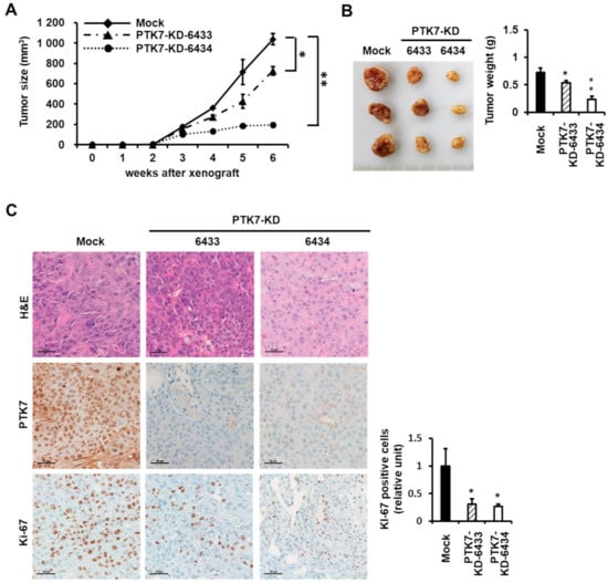 Four to five-week-old male immune-deficient athymic nude (BALB/c nu/nu) mice were purchased from Orient Bio Inc. (Gyeonggi, Korea). To investigate the effect of PTK7 on tumorigenesis in a xenograft mouse model, 1 × 106 KYSE-30 cells expressing either PTK7-FLAG or PTK7 shRNA (PTK7-KD-6433 and 6434) were resuspended in growth-factor-reduced Matrigel (Corning) and subcutaneously injected into the backs of mice. Tumor growth in each group was evaluated by measuring the tumor size twice per week using calipers (length × width × depth/2). Mice were sacrificed 6 weeks after cell injection. The xenograft tumors were recovered to measure tumor weight, fixed in formalin, and were paraffin embedded for histological and immunohistochemical analyses [].