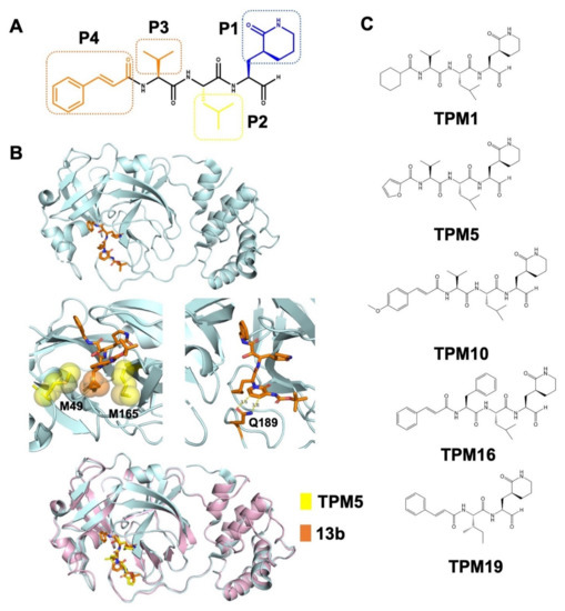 Rational design of peptidomimetic molecules as SARS-CoV-2 3CLPro inhibitors. (A) Scheme of the TPM design with the P1–P4 chemical groups labeled (the chemical structural formula of TPM16 was shown as an example). (B) Structural model of the lead compound 13b bound with 3CLPro (PDB ID: 6Y2F). The interactions between the P2 cyclopropyl group and the M49/M165 residues and the interactions between the P3 pyridone ring and the Q189 residue are illustrated in the middle panel (van der Waals interactions represented as spheres). 13b and TPM bound 3CLPro with similar modes in the superimposed model (lower panel). (C) Chemical structures of TPM1, 5, 10, 16, and 19.