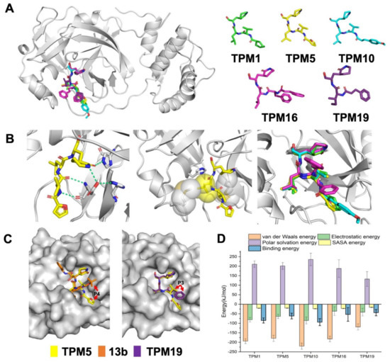Crystal structures of the 3CLPro–TPM complexes. (A) 3D representation of five TPMs and their overall binding modes. (B) The P1 δ-lactam ring formed polar interactions (green, dash line) with S1 residues (left), P2 isopropyl group stacked with S2 hydrophobic residues (middle), and the alignment of isopropyl groups from different TPMs (right). (C) The P3/P4 group of TPM5 bound into the S3/S4 groove in comparison to that of 13b or TPM19. (D) The binding energies between 3CLPro and TPMs from all-atom simulations.