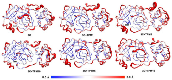 Conformational plasticity of 3CLPro and 3CLPro–TPM complexes. The red bulges indicate flexible regions, while the blue colored regions were relatively rigid. TPMs 1, 5, and 10 significantly reduced the flexibility of the H41 residue.