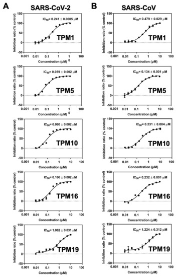 Dose–response curves of TPMs in the 3CLPro enzymatic activity assays. IC50 of inhibitors on SARS-CoV-2 (A) and SARS-CoV (B) 3CLPro. From top to bottom: TPM1, TPM5, TPM10, TPM16, and TPM19. The TPM’s mediated inhibition was measured for both SARS-CoV-2 and SARS-CoV 3CLPro. Bars depict the mean ± SE, n = 3.