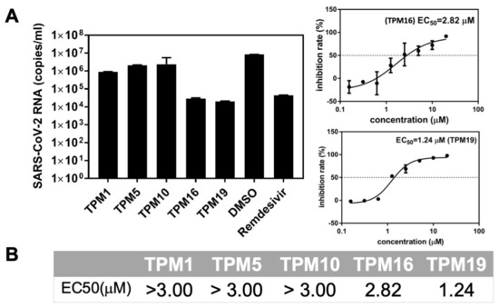 Anti-SARS-CoV-2 activity of the TPMs. (A) Left: The viral inhibitory activities were measured in Vero E6 cells at a final concentration of 10 μM. The cells were pre-treated with indicated compounds for 2 h, infected with SARS-CoV-2, and incubated for 2 days before the total RNA was isolated from cell lysates. The viral RNA content was analyzed with qPCR. DMSO was used as the vehicle control, and remdesivir was used as the positive control. Right: representative measurement of EC50 for the TPM ligands. (B) Summary of EC50 on Vero E6 cells.