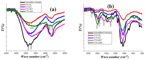 Figure 1a,b displays FT-IR spectra of (unmodified chitosan), (CTS-GL), (CTS-EC), (CTS-DET), and (CTS-CAA) at a limited wavenumber range, while the FT-IR spectra of these samples within the full wavenumber range is provided in the supplementary file (Figure S1). The analysis of the FT-IR spectra provided reliable information on the efficacy of the synthesis procedure used for the chitosan modification.