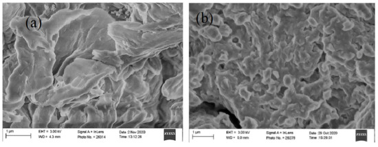 Scanning electron microscopy images for unmodified chitosan (a) and CTS-CAA (b).
