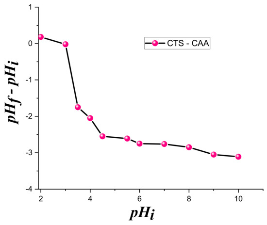 The titration curve of pHPZC estimation for (CTS-CAA) sample is presented in Figure 3. The obtained results can be useful to investigate the effect of the modification on the surface charge of chitosan.
