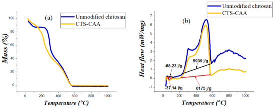 As displayed in Figure 5b, the DSC curves of both unmodified chitosan and CTS-CAA present an exothermic peak centered at ca 520 °C that can be attributed to the degradation of the polymeric chains. There has been a noticeable enlargement in the endothermic peak area of (CTS-CAA) in comparison with that obtained for unmodified chitosan. This could be assigned to the fact that the hydrogen bonds between the amino groups and water molecules in the case of unmodified chitosan are weaker than those formed with the terminal carboxyl groups in the case of (CTS-CAA), hence the temperature required to remove those water molecules will be greater in the case of (CTS-CAA) than in the case of unmodified chitosan.