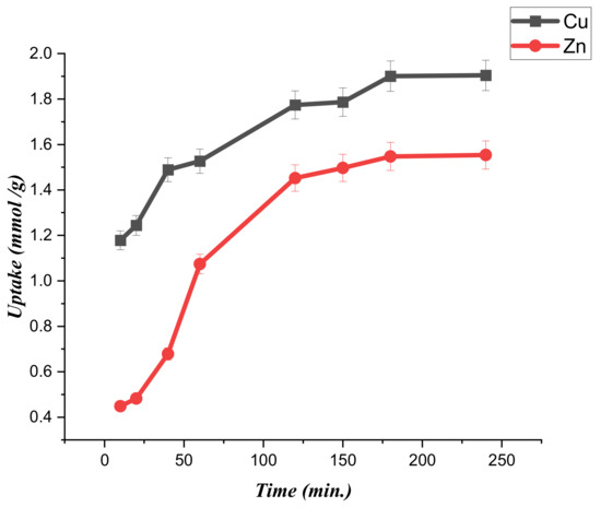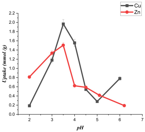 The pH conditions affect the speciation of the metal and control the adsorbent’s surface charge. As a result, the pH may control the entire adsorption system. According to the data in Figure 3, (CTS-CAA) possesses a negative surface charge for pH > 3. Therefore, the modified chitosan is negatively charged for the pH conditions (ranging between 3.5 and 6) used in the adsorption experiments. Namely, the carboxylate groups on the surface of (CTS-CAA) are deprotonated within the studied pH range, while the metal ions are positively charged. On this basis, we could predict that electrostatic attractions between the metal ions and the negatively charged surface of the modified chitosan at a pH range between 3.5 and 6. The adsorption capacity could be imputed to the chelation mechanism between metal (Cu, Zn) ions and the –(COO)− of (CTS-CAA). In contrast, the protonation of the (CTS-CAA) amino groups is expected at a pH < 2.5, reducing the adsorption capacity of the modified chitosan towards the heavy metals. These considerations were confirmed by the experimental results on the uptake capacity of the (CTS-CAA) sample towards both copper and zinc ions (Figure 6). It can be estimated that the greatest uptake for both metal ions occurred at pH = 3.5. In particular, the uptake values are 1.96 ± 0.05 mmol/g and 1.505 ± 0.04 mmol/g for copper and zinc metal ions, respectively.