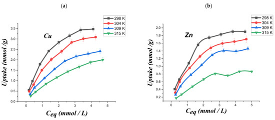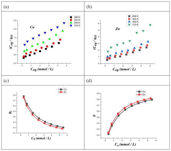 The linearity predicted by Equation (8) was observed in the (Ceq/qe) vs. Ceq plots (Figure 9a,b) for both copper and zinc ions at the different investigated temperatures. On this basis, we could assert that the Langmuir model is appropriate for the description of the adsorption process. Accordingly, we can conclude that (CTS-CAA) possesses a homogeneous surface with energetically equal adsorption sites.
