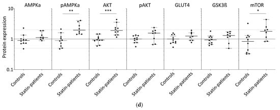 The translocation of GLUT4 is mediated either by AKT via insulin stimulation or AMPK activation via contraction. The AKT/mTOR pathway is essential for skeletal-muscle cell regeneration. We further analyzed AMPKα, phosphorylated AMPKα, AKT, phosphorylated AKT, GSK3ß, and mTOR which are known to be involved in glucose metabolism (Figure 1b,c). As is known, AMPKα is phosphorylated and activated by several factors, i.e., insulin, leptin, calcium changes, or muscle contraction. Total AMPKα levels were not differentially expressed between statin patients and controls, but we found a statistically significant increase in phosphorylated AMPKα in statin-treated patients of 77% (Figure 1b–d). Phosphorylated AKT blocks AMPKα activity. The total AKT levels were significantly higher in statin-treated patients, whereas phosphorylated AKT levels were lower and consequently 22% less at activated state (Figure 1b–d). Activated AKT inhibits GSK3ß by phosphorylation, whereas mTOR activates GSK3ß, which is necessary for glycogen synthesis. The mTOR levels were slightly increased and GSK3ß levels were not different in statin-treated patients compared with controls (Figure 1b,c).