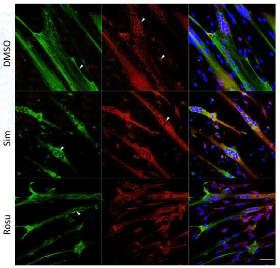 The active forms of simvastatin (hydrophobic) and rosuvastatin (hydrophilic) were purchased from Calbiochem and LKT Laboratories. Both statins were dissolved in DMSO (Sigma Aldrich, St. Louis, MO, USA) and used at 5 µM concentrations after initial testing as recently published [26]. A skeletal-muscle growth medium was obtained from ProVitro (Berlin, Germany). Opti-MEM and GlutaMax were purchased from Invitrogen (Berlin, Germany). All antibodies are listed in Table 2. The pre-stained protein marker PageRuler™ Plus was from Thermo Scientific (St. Louis, MO, USA), and HiMark™ was obtained from Invitrogen (Berlin, Germany). Krebs Ringer buffer solution at pH 7.4 was composed of 25 mM HEPES, 135 mM NaCl, 3.6 mM KCl, 1 mM CaCl2, 0.5 mM MgSO4, 0.5 mM KH2PO4, and 5 mM NaOH. Protein lysis buffer at pH 7.4 contained 20 mM Tris, 150 mM NaCl, 1 mM EDTA, 1 mM EGTA, 1% TritonX-100, 1 mM PMSF, 1 mM glycerol phosphate, 1 mM Na3VO4, 1 mM NaF, 2.5 mM Na4O7P2, 1x PhosSTOP (Roche, Mannheim, Germany), and 1x Complete EDTA-free (Roche, Mannheim, Germany).