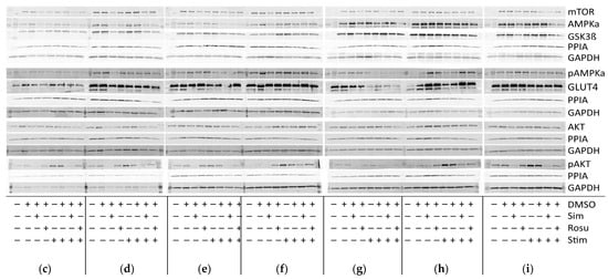 In non-stimulated, statin-treated human primary myotubes, AMPKα levels were decreased with both statins, but active AMPKα remained at similar expression levels in all groups (Figure 3a,c–i). Stimulation with glucose and insulin slightly increased these protein levels, but they remained significantly decreased in simvastatin-treated myotubes. A change in the AMPKα total content confirms that changes in AMPKα phosphorylation levels between the groups and a ratio may be favored. The pAMPKα/AMPKα ratio increased by 139% and 76% for simvastatin and rosuvastatin, respectively, in non-stimulated human primary myotubes and decreased within the stimulated group (Figure 3a). In contrast, we found normal AKT levels in all groups, whereas phosphorylated AKT was decreased under simvastatin but unchanged with rosuvastatin without stimulation (Figure 3a,c–i). These levels were more diminished in stimulated statin-treated myotubes. The pAKT/AKT ratio decreased by 65% for simvastatin and increased by 92% for rosuvastatin in non-stimulated human primary myotubes but decreased further within the stimulated group (Figure 3a). The GSK3ß levels (Figure 3a,c–i), inhibited by phosphorylated AKT, as well as those of mTOR (Figure 3a,c–i), which is relevant for GSK3ß activation, were both decreased under simvastatin. mTOR levels also decreased after treatment with rosuvastatin in the non-stimulated group. Unexpectedly, mTOR protein levels increased within 5 min of insulin/glucose stimulation. We therefore tested for mTOR activity regulated by phosphorylation. mTOR phosphorylation (Ser2448) was not significantly different from the unstimulated control under any condition (Figure 3b). Although mTOR total and phosphorylation levels were determined using different methods, decreased total mTOR levels after statin treatment and normal mTOR phosphorylation (Ser2448) compared to control indicate an increased mTOR phosphorylation (Ser2448) ratio for statin-treated primary human myotubes.