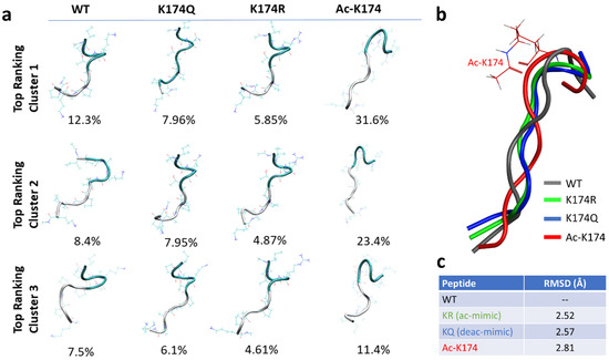 To obtain more reliable initial states of the modified and non-modified peptide fragments, Replica Exchange Molecular Dynamics (REMD) were run first [23]. Eight replicas of each system at a temperature range of 270–560 K were run for 200 ns and the conformations were collected at 300 K. Then, the conformations were clustered using K-means clustering, as shown in Figure 1a. The highest-ranking conformation from each top-ranked cluster (Figure 1b) was then selected for subsequent studies. The Root Mean Square Deviation (RMSD) of each selected fragment was then calculated against the native wild type (WT)—non-modified K174 containing monomers. As shown in Figure 1c, the highest deviation of 2.81 Å was found for the ac-K174 containing monomers followed by the glutamate mutated (KQ) ac-mimic and arginine mutated (KR) deacetyl mimic containing mutated monomers. The higher deviation in terms of RMSD of acetylated fragments suggested that the modification of K174 affected the overall structure of the individual peptide fragment.