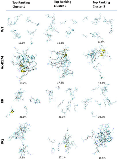 To investigate the overall structural changes during the spontaneous aggregation of different systems, cluster analysis based on K-means algorithm was performed and the results are given in Figure 2 and Figure S2, respectively. Firstly, cluster analysis was performed to identify the most prominent conformations of 16-chain oligomers obtained by MD simulation. As shown in Figure 2, in the case of native WT 16-chain oligomers, the cluster analysis showed that that there is no obvious difference between each cluster. In all clusters of the native WT system, the peptides tend to move far apart from each other, and the aggregation tendency is low. In the case of the ac-K174 16-chain oligomers, reversely, there was an obvious aggregation tendency and the formation of β-sheet structure in the top three clusters (up to 50% in total). In the case of ac-mimic KQ 16-chain oligomers, initially the peptides were scattered far apart from each other. As the simulation proceeded further, they tended to move towards each other and form more associations and aggregates. There is also a marked increase in the β-sheet propensity and dimerization. While in the case of the deac-mimic KR system, even in the highly populated clusters there are many peptides that do not make any kind of association with other peptides. Other highly populated clusters have similar distribution with that of the native WT 16-chain oligomers.