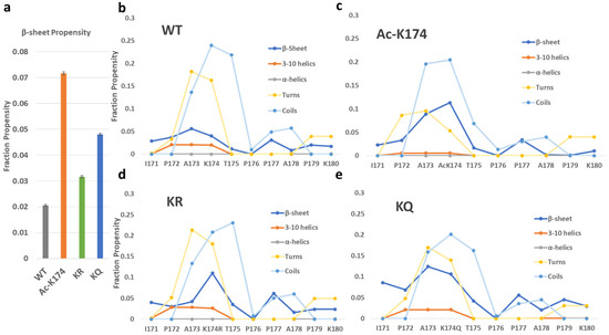 To reveal the structural changes during the simulation, the secondary structure analysis based on the whole trajectory and the evolution of β-sheet structure of each residue over a time period of 2 μs were calculated by DSSP [24] analysis, and the obtained results were shown in Figure 3 and Figure S4. The secondary structure profile of the acetylated and mutated fragments varies from that of the non-modified fragments. As shown in Figure 3 and Figure S4, the ac-K174 16-chain oligomers have the highest β-sheets propensity compared with other systems. The highest difference in the β-sheet propensity can be seen among the WT and ac-K174 16-chain oligomers. The β-sheet propensity of the glutamate mutated ac-mimic KQ 16-chain oligomers remained slightly higher than that of the deac-mimic KR 16-chain oligomers and native WT 16-chain oligomers system. The deac-mimic KR 16-chain oligomers have a very similar pattern to that of the WT 16-chain oligomers, which is shown in Figure S4. This indicates that, to a certain extent, actual acetylation and mimic-acetylation have slightly different effects on the structure of Tau protein, which could be attributed to the shorter side chain and the absence of an amino group in glutamine mutated 16-chain oligomers compared with that of the acetylated lysine containing 16-chain oligomers. As shown in Figure 3b–e, secondary structure analysis of the peptides shows a considerably larger percentage of turn and coils. Change in the secondary structure can be solely associated with the type of modification occurring at the lysine residue. It is noteworthy that the acetylation (ac-K174) or ac-mimic mutations (K174Q) at K174 position also tend to improve the β-sheet propensity of the adjacent residues as shown in Figure 3b–e. Due to the fact that acetylation or acetyl-mimic mutation increases in the β-sheet propensity of the Tau oligomers, there is a decrease in the turns and coils propensity of the ac-K174 and KQ 16-chain oligomers. A higher β-sheet propensity of Tau fragments in aggregates has been advocated by previous studies [10], and our findings also suggest that acetylation (ac-K174) or acetylation-mimicking mutations (KQ) tend to change the overall secondary structure from random turns and coils to enhanced β-sheet propensity.