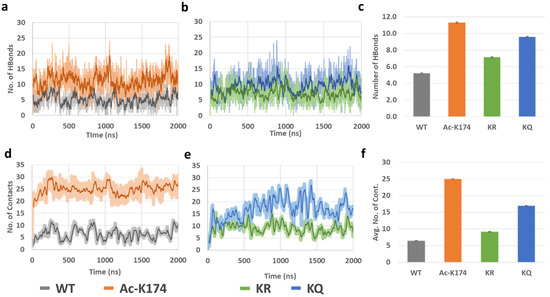 Interpeptide contact analysis displayed a very similar pattern to that of the hydrogen bond analysis, as shown in Figure 4d–f. The average number of contacts were plotted to determine any visible difference (Figure 4f). The acetylated (ac-K174) and ac-mimic KQ 16-chain oligomers were observed to form the highest number of inter-peptide contacts in contrast to that of non-modified WT and deac-mimic KR 16-chain oligomers. The average number of interpeptide contacts formed by the ac-K174 16-chain oligomers were fluctuating at around 15~25 versus 5~10 in the case of the non-modified native WT 16-chain oligomers. In the case of the ac-mimic KQ versus deac-mimic KR 16-chain oligomers, a similar pattern was found.