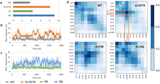 Furthermore, to investigate the oligomerization effect of different modifications, the maximum oligomer size of the respective peptides was analyzed. As shown in Figure 5a, the ac-K174 16-chain oligomers were observed to exhibit the maximum oligomerization state with the average number of peptides spanning around 8–10. The acetylation mimicking KQ mutated 16-chain oligomers have an average number of oligomer size around 9–12. The native WT 16-chain oligomers and the de-acetylated mimicking KR 16-chain oligomers demonstrated the least oligomerization with respect to time. Furthermore, to identify key residues during the spontaneous aggregation, inter-residue contact maps were constructed [25] and the results were shown in Figure 5d. The contact map displays the probability of residues contact during oligomerization. For the ac-K174 16-chain oligomers system, the acetylated lysine ac-K174 depicts the highest number of inter-residue contacts. Followed by the acK174–acK174 contacts, the highest number of contacts was found for I171–acK174, P172–acK174, A173–acK174 and T175–acK174, respectively. Similar to the ac-K174 system, the KQ mutated peptides were shown to have a higher number of intrapeptide contacts. The notable contacts include I171-I171, K174Q–K174Q, I171–K174Q and T175–K174Q, respectively. For the non-modified WT peptides, a higher number of intrachain I171–I171 interactions were prominent. From Figure 5, due to the acetylation of K174 in ac-K174 16 chains, the ac-K174-ac-K174 contacts occur frequently and thus the I171–I171 number of contacts remains lower, whereas due to the absence of the acetylated K174, there are no ac-K174-ac-K174 contacts and therefore the I171-I171 contacts are of the highest number for both KQ and WT 16 chains. In the case of deac-mimic KR, the highest number of intrapeptide interactions of T175–T175 and K174R–T175 was observed. Thus, from the interpeptide contact analysis it is evident that the acetylation of K174 or its ac-mimic mutation K174Q renders the monomers to associate with each other more frequently and high order oligomers are thus formed.