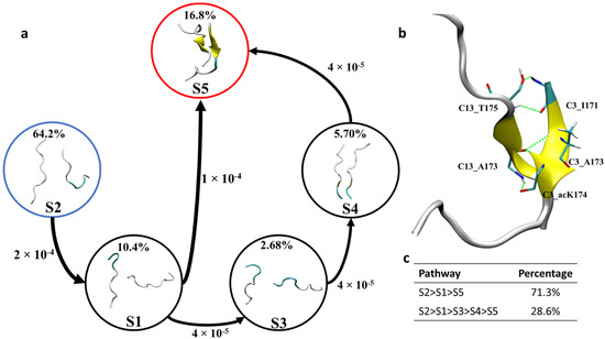 As shown in Figure 6, transition pathway analysis of C3–C13 dimers revealed that the most abundant extended antiparallel β-sheet dimer, i.e., macrostate S5 can be formed via two different pathways. Firstly, the initial macrostate S2 transitions to macrostate S5 via S1. This pathway is the dominant transition pathway and encompasses about 71.3% of the total transitions. The second pathway (28.6% of the total transition) is the transitioning of macrostate S2 into macrostate S5 via macrostates S1, S3 and S4, in turn.