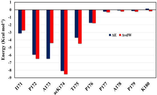 Per-residue energy contribution of acK174 (C3–C13) dimer. The difference in total energy and van der Waal’s energy is shown in the blue bar graph and orange line graph, respectively.