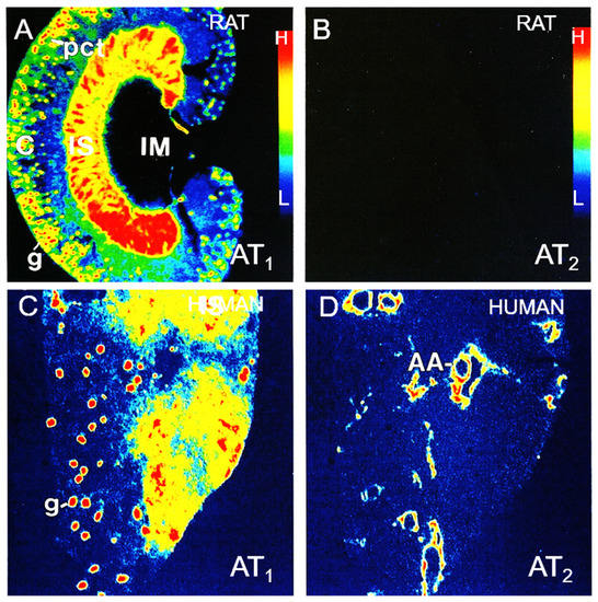Localization of angiotensin II AT1 and AT2 receptors in the rat (A,B) and human kidney (C,D) by quantitative in vitro autoradiography using radiolabeled [125I]-angiotensin II as a ligand. AT1 receptor binding is defined as [125I]-angiotensin II binding in the presence of an excess concentration of unlabeled AT2 receptor blocker PD123319 (10 µM), whereas AT2 receptor binding is defined as [125I]-angiotensin II binding in the presence of an excess concentration of unlabeled AT1 receptor blocker losartan (10 µM), respectively. Red represents the highest level of binding, whereas blue represents the background level of binding. C, cortex; IS, inner stripe of the outer medulla; IM, inner medulla; AA, blood vessels including afferent and efferent arterioles and interlobular arteries; g, glomerulus; pct, proximal convoluted tubule. Modified from References [,,].