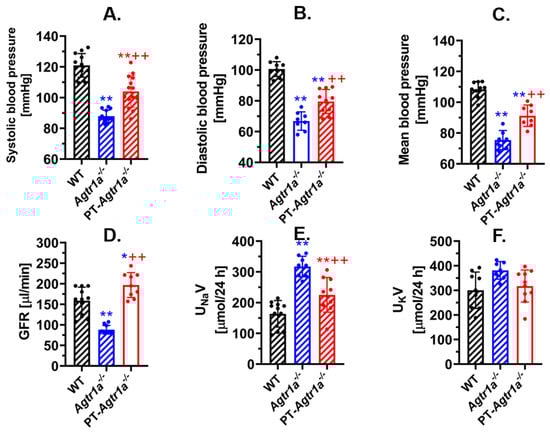 Effects of global or proximal tubule-selective deletion of AT1a receptors on basal systolic, diastolic, and mean arterial blood pressure (A–C), glomerular filtration rate (D), and natriuretic response (E) in whole-body Agtr1a-/- or proximal tubule-specific PT-Agtr1a-/- mice compared with wild-type mice. Note that Agtr1a-/- mice showed that basal blood pressure was ~30 mmHg lower than wild-type mice, whereas PT-Agtr1a-/- mice had basal blood pressure ~15 mmHg lower than wild-type mice, respectively. (F) shows no changes in 24 h urinary potassium excretion. * p < 0.05 or ** p < 0.01 vs. WT mice; ++ p < 0.01 vs. global Agtr1a-/- mice. Reproduced from Reference [] with permission.