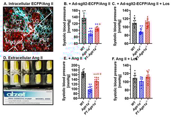 Angiotensin II-induced hypertension by adenovirus-mediated, sglt2 promoter-driven proximal tubule-specific overexpression of an intracellular Ang II fusion protein Ad-sglt2-ECFP/Ang II in the kidney (A–C), or osmotic minipump infusion of a pressor dose of Ang II (D–F) in wild-type mice was significantly attenuated in proximal tubule-specific PT-Agtr1a-/- mice. In response to proximal tubule-specific overexpression of Ad-sglt2-ECFP/Ang II, blood pressure was elevated by 17 ± 3 mmHg in wild-type mice, and the increase was totally blocked in PT-Agtr1a-/- mice (B). Infusion of a high pressor dose of Ang II for 2 weeks (1.5 mg/kg/day, i.p.) markedly increased blood pressure by >45 mmHg in wild-type mice, and this increase was attenuated by half in PT-Agtr1a-/- mice (E). Concurrent treatment with the AT1 receptor blocker losartan (20 mg/kg/day, p.o.) normalized blood pressure to the wild-type control levels. ** p < 0.01 vs. wild type; + p < 0.05 or ++ p < 0.01 vs. Agtr1a-/- mice. Reproduced from Reference [] with permission.