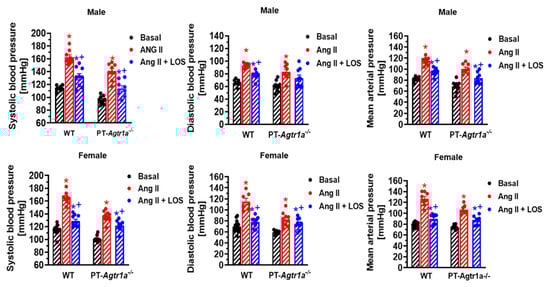Basal systolic, diastolic, and mean arterial blood pressure and in response to osmotic minipump infusion of a high pressor dose of Ang II with or without AT1 (AT1a) receptor blocker losartan for two weeks in adult male and female wild-type and PT-Agtr1a-/- mice. Note that deletion of AT1a receptors selectively in the proximal tubules significantly decreased basal blood pressure by ~13–15 ± 3 mmHg similarly in male and female PT-Agtr1a-/- mice under basal conditions. In addition, Ang II-induced hypertension was significantly attenuated in both male and female PT-Agtr1a-/- mice. * p < 0.05 vs. control WT or PT-Agtr1a-/- mice; + p < 0.05 vs. Ang II-infused male or female wild-type or PT-Agtr1a-/- mice. Reproduced from Reference [] with permission.