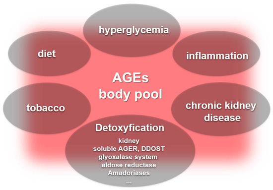 - Gill, V.; Kumar, V.; Singh, K.; Kumar, A.; Kim, J.-J. Advanced Glycation End Products (AGEs) May Be a Striking Link Between Modern Diet and Health. Biomolecules 2019, 9, 888. [Google Scholar] [CrossRef]