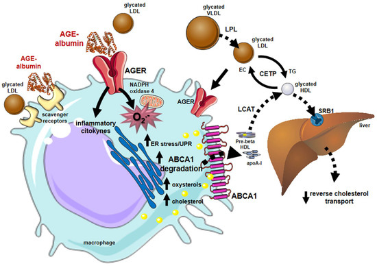 - Daffu, G.; Shen, X.; Senatus, L.; Thiagarajan, D.; Abedini, A.; Hurtado Del Pozo, C.; Rosario, R.; Song, F.; Friedman, R.A.; Ramasamy, R.; et al. RAGE Suppresses ABCG1-Mediated Macrophage Cholesterol Efflux in Diabetes. Diabetes 2015, 64, 4046–4060. [Google Scholar] [CrossRef] [PubMed]
