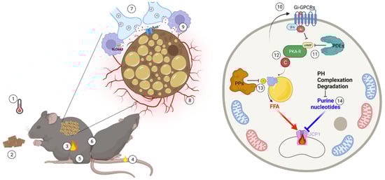 - Bast-Habersbrunner, A.; Fromme, T. Purine Nucleotides in the Regulation of Brown Adipose Tissue Activity. Front. Endocrinol. 2020, 11, 118. [Google Scholar] [CrossRef]
