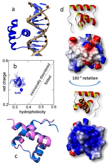 (a) X-ray structure of enHD bound to specific DNA (pdb code 1HDD) showing its three-helix bundle structure and binding via the insertion of the third α-helix into the DNA major groove. (b) EnHD amino acid sequence has the net charge versus hydrophobicity profile of an intrinsically disordered protein according to [29]. (c) Superposition of the X-ray structures of enHD bound to DNA (pdb code 1HDD, pink) and free (pdb code 1ENH, blue), both obtained at very high salt concentration. (d) Electrostatic potential of enHD in two orientations. The highly positively charged face that is involved in the interaction with DNA is displayed at the bottom.