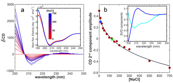 (a) Difference far-UV circular dichroism (CD) spectra of enHD as a function of NaCl concentration. The inset shows the spectra at the two extremes (0 and 700 mM NaCl). (b) Singular value decomposition of the CD spectra of enHD as a function of NaCl. The two first components are shown in the inset (first: cyan, second: blue) and the amplitude of the second component is given in the main panel. The black curve corresponds to a fit to the Debye–Hückel ionic strength equation. The two stars signal the salt concentrations of the NMR spectra in panel c (same color code).