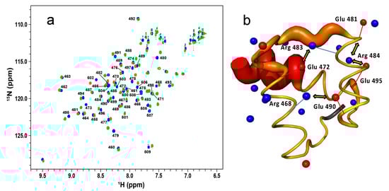 We then investigated the response to ionic-strength by NMR. Figure 3a shows the 1H-15N HSQC spectrum of enHD at pH 6 in the presence of 25 mM (blue) and 120 mM NaCl (green). We used pH 6 for NMR analysis because it was the value closest to physiological pH that reduced solvent exchange enough to resolve all the backbone amide peaks in the HSQC spectrum, even at low salt concentrations. The difference in ionic strength between these two experiments results in noticeable changes in the HSQC spectrum that are suggestive of a moderate increase in structure (more spectral spread) at higher ionic strength. These spectra correspond to conditions that amount to about one third of the total structural change observed by CD in the 0 to 700 mM range (stars in Figure 2b). Further consistency with CD results is provided by the observation that the HSQC spectrum of enHD continues to change as ionic strength increases further (secondary chemical shifts for 700 mM NaCl are discussed in Section 2.3). Mapping of these secondary chemical shifts onto the native structure reveals that most of the structural change concentrates on the regions with the most positive charge, including helix 3 (mainly is C-terminus), the end of helix 1 and the loop region connecting helices 1 and 2 (Figure 3b).