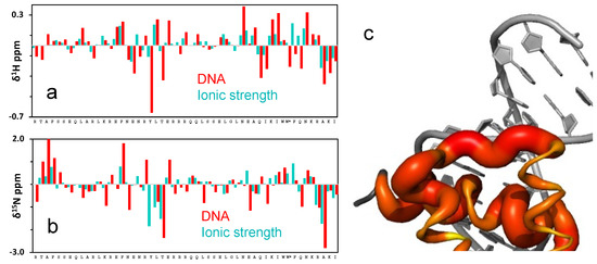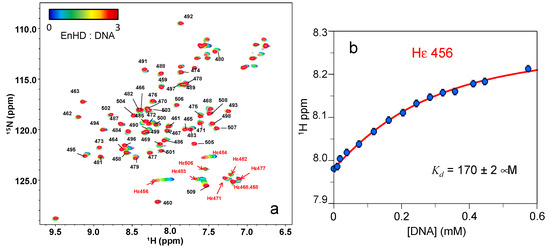 where Ka is the inverse of the dissociation constant Kd. We fitted these equations to the 1H chemical shift data of R456, which experiences the largest shift with DNA (Figure 6a). The model reproduces the data well, thus supporting the assumption of 1:1 binding, and confirming that binding is indeed in the sub-mM range: Kd of 170 ± 2 μM (Figure 6b). Hence, at these conditions, the affinity of enHD for cognate DNA is very low. This is expected because such high ionic strength should largely screen the electrostatic interactions between enHD and the DNA phosphate backbone. We can thus conclude, that electrostatic interactions play a primary role in driving the binding of enHD to cognate DNA, in agreement with previous studies [17,58]. In addition, we should be mindful that at pH 4 the nitrogenous bases of DNA start to titrate. Partial ionization of the bases could destabilize the double-stranded DNA structure [59] and hence contribute to further decreasing binding affinity in these conditions.