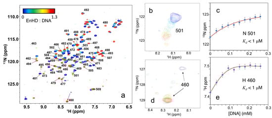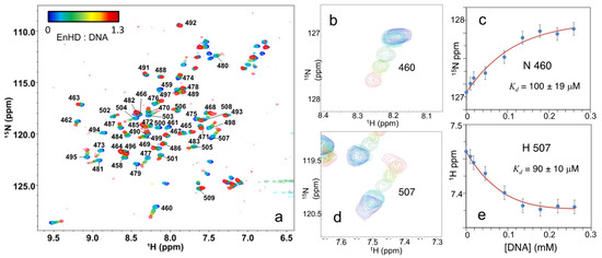 (a) Series of 1H-15N-HSQC NMR spectra of enHD (0.2 mM in 25 mM phosphate buffer at pH 6.8 and 50 mM NaCl) at different concentrations of cognate DNA up to a 1:1.3 ratio of enHD to DNA. Numbered black labels indicate the residue assignment in reference to the full engrailed sequence. The color bar on the top left indicates the particular enHD to DNA ratio for each spectrum. ((b) Detail of the spectral region corresponding to residue 501 (colors as in (a)). (c) 15N chemical shift of residue 501 as a function of cognate DNA concentration fitted to an equilibrium binding equilibrium (red line, Equations (1) and (2)). (d) Detail of the spectral region surrounding the A460 backbone amide cross-peak (colors as in (a)). (e) 1H chemical shift of A406 backbone amide as a function of DNA concentration fitted to an equilibrium binding equilibrium (red line, Equations (1) and (2)).