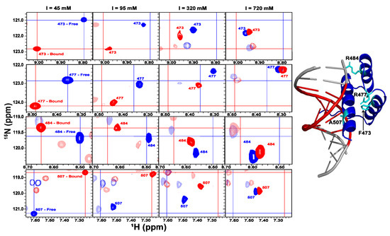 Interplay between ionic strength and cognate DNA binding in enHD monitored by NMR. (Left) each row shows the region of the 1H-15N-HSQC NMR spectra showcasing the amide cross-peak of one enHD residue at the four experimental conditions used in this study, corresponding to the ionic strengths indicated on top. Blue is for the free protein and red is for the protein in excess of cognate DNA. The crosses signal the center position at the lowest ionic strength for tracking purposes. The residues are (from top to bottom) F473, R477, R484, and A507. (Right) X-ray structure of the complex, which correlates with the highest ionic strength (rightmost) NMR spectrum, is shown with the 4 showcased residues in cyan.