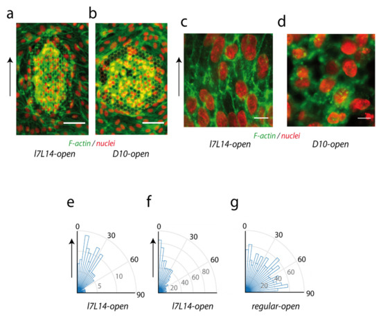 Cellular organization in the top monolayer. (a,b) Global HUVECs coverage of (a) l7L14-open and (b) D10-open microstructures. VEGF 0.5 ng/mL. z projection is shown, red: nuclei, green: F-actin, bar 50 µm. (c,d) Detail of the top monolayer covering (c) l7L14-open, with the axis of elongation of hexagons represented by a black arrow (top, left), and (d) regular D10-open microstructures. Red: nuclei, green: F-actin, z projection of planes above structures, cells fixed at time of structure colonization (2 (b,d) or 3 (a,c) days after cell seeding). Scale bar 10 µm. (e–g) Histograms of nuclei orientations in the top layer above the microstructures. Only the part of the nuclei above 4 µm height was considered. (e) l7L14-closed (127 nuclei in 7 structures) (f) l7L14-open (700 nuclei in 15 structures) (g) D4.5, D6.6, D8.8, D10, and D13.5-open microstructures (1051 nuclei in 23 structures). Vertical arrows in (a,c,e,f) represent the reference axis for elongated structures. For regular structures, the reference axis was chosen perpendicular to one size of the hexagon (not shown).