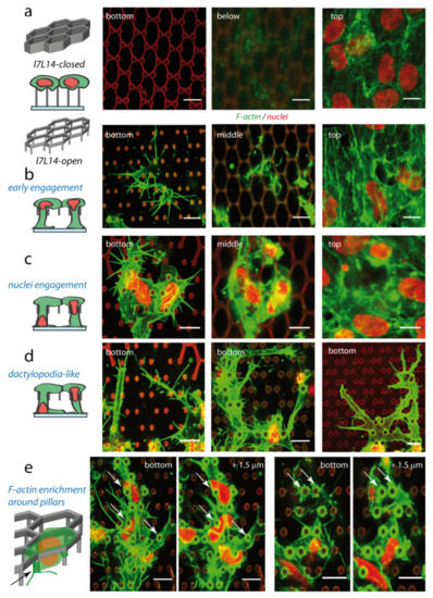 HUVECs organization on closed and open microstructures. Left, schemes of hexagonal lattices, and side or 3D views of typical HUVECs organization after colonization. Right, confocal planes, denoised images, scale bar 10 µm. Red: nuclei and microstructure autofluorescence, green: F-actin. Cells were cultivated in standard conditions (VEGF 0.5 ng/mL) unless otherwise specified. Cells were fixed at time of structure colonization (2 (b,d-middle, d-right), 3 (d-left) or 4 (a,c) days after cell seeding). (a) Closed microstructures. Confocal planes on HUVECs on l7L14-closed microstructure. Left, bottom plane (contact with the bottom substrate); middle, just below the structure (1.2 µm below the top of the structure); top, above the structure. (b–e) Typical examples of colonization of open l7L14-open structures, with vertical engagement and formation of filopodia in the bottom plane: (b) with limited cell area on the basal substrate), (c) with larger membrane and nuclei vertical engagement, (d) with formation of extended, dactylopodia-like protrusions, and (e) typical enrichment observed for F-actin around the micropillars, white arrows. (b,c) From left to right, bottom plane; middle plane (at the level of the closed part of the structure); top, above the structure. (d) Dactylopodia-like protrusions were observed without (d-left) or with (d-middle,right) VEGF in the media. Bottom planes are shown. For d-left, correspondent membrane labelling with bottom, middle and top views is shown in Figure A3c. (e) Two examples of bottom and top planes are shown.
