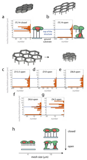 The vertical engagement is also expected to depend on the horizontal mesh size [37]. Therefore, we studied the engagement of HUVECs on open regular structures of different dimensions D, from 13.5 µm to 4.5 µm (Figure 4c–g). As for l7L14-open structures, the majority of nuclei were able to engage vertically and to contact the bottom substrate for D13.5-open, D10-open and D8.8-open structures (Figure 4c–e), in agreement with the fact that D8.8-10 structures have a surface area close to l7L14 structures (respectively, 58%, 78% and 64% of nuclei below 5 µm). Nuclei engagement was intermediate for D6.6-open structures (44% nuclei below 5 µm, Figure 4f). In contrast, almost no engagement was observed in smaller D4.5-open microstructures (6% nuclei below 5 µm, Figure 4g).