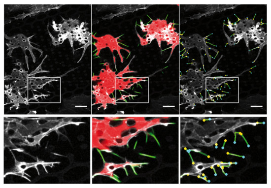 - Urbančič, V.; Butler, R.; Richier, B.; Peter, M.; Mason, J.; Livesey, F.J.; Holt, C.E.; Gallop, J.L. Filopodyan: An open-source pipeline for the analysis of filopodia. J. Cell Biol. 2017, 216, 3405–3422. [Google Scholar] [CrossRef] [PubMed]