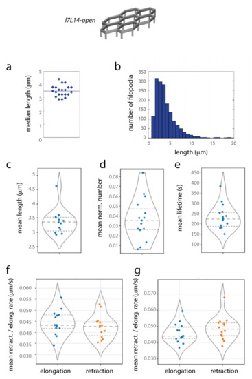 The length of filopodia could extend to 10–15 µm, with an average length of 4.18 ± 2.97 µm (median 3,43 µm, n = 1651 filopodia, in 21 structures) as assessed from fixed samples (Figure 6a,b). Filopodia orientations compared with structure axes were computed; indeed, the geometry of pillars may be important for filopodia formation, in line with the observation that a significant number of filopodia emerged near pillars and extended preferentially in the direction of other pillars (Figure 3b–e). Indeed, we observed an asymmetry of filopodia orientations in elongated l7L14-open hexagonal lattices, due to the asymmetry of pillar organization, in particular for long filopodia (lengths > 5 µm) (Figure A4), while in regular microstructures filopodia had globally isotropic orientations (Figure A5g,h).