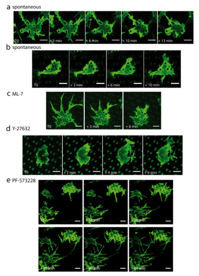 Transition between different protrusive modes in the microstructures, and molecular mechanisms. (a,b) Spontaneous transitions between an amoeboid state and a mesenchymal state (a), and between a mesenchymal and an amoeboid state (b). (c–e) Kinetics of the representative effects of (c) ML-7 (10 µM), (d) Y-27632 (10 µM), or (e) PF-573228 (10 µM) addition on Lifeact-GFP HUVECs cells (green, Lifeact-GFP), z projection of the bottom planes. (a,b) T0 refers to an arbitrary moment chosen as time origin, (c–e) T0 refers to the time of drug addition. Movies were acquired 1 day after cell seeding. Scale bar 10 µm (a–d), 15 µm (e).