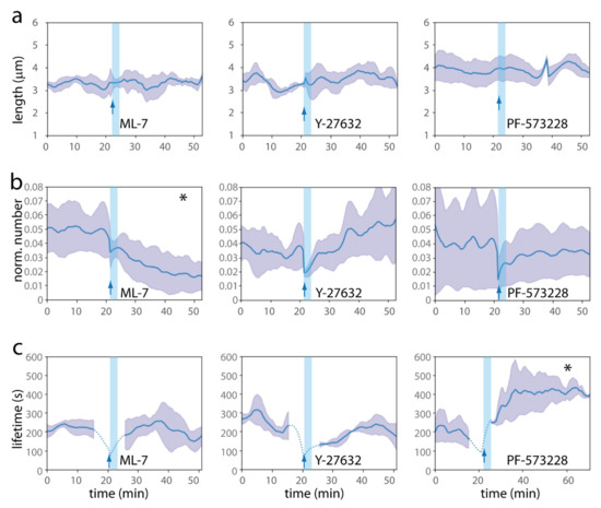 Quantitative analysis of ML-7, Y-27632 and PF-573228 effect on filopodia dynamics. (a–c) Evolution along time of (a) mean filopodia lengths, (b) normalized number of filopodia (normalization by the perimeter, in µm, of the cell islets inside the structure), and (c) mean lifetimes of filopodia present at this time, for ML-7 (left), Y-27632 (middle) and PF-573228 (right) treatments, n = 3 independent experiments per condition. Error: S.D. Pre-treatment and post-treatment graphs are concatenated. The blue arrow indicates the time of drug addition. The light blue vertical bar indicates a state of stabilization of the system after media change (~3 min long). The dotted lines for lifetime (c) refer to times where the lifetime cannot be precisely assessed, because of the imaging interruption during media changes (durations, ~1 mean filopodia lifetime before and after drug addition; see Materials and Methods). * in (b) ML7, and (c) PF-573228, indicates statistically significant differences before and after drug addition, with p < 0.05 (see Figure A7b–d).
