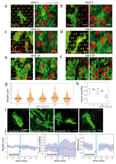Dependence on VEGF. (a–h) HUVECs were cultivated on l7L14-open microstructures, and long-term cultures were performed in different VEGF concentrations. Cell organization was studied from fixed samples. (a,b) Culture without VEGF: (a) ECGM media (Promocell), which contains no VEGF supplement, (b) ECGM2 media without the VEGF supplement. (b–e) Standard ECGM2 media with (c) 0.5 ng/mL VEGF, (d) 5 ng/mL, (e) 20 ng/mL, and (f) 50 ng/mL. (a–f) Red, nuclei (and structure autofluorescence), green, F-actin. Bottom and top planes are represented. Cells fixed at time of structure colonization (2 (b–f) or 3 (a) days after cell seeding). Denoised images, bar 10 µm. (g,h) Quantification for experiments realized in parallel in the different VEGF concentrations (2 days after cell seeding). The figure corresponds to an experiment where the five VEGF concentrations were analysed simultaneously, with two structures per condition. The generation of numerous filopodia for the conditions VEGF0 was observed in 3 additional independent microstructures (see raw data). (g) Histograms of filopodia lengths (black bar, mean value, red bar, median value). (h) Number of filopodia normalized by the perimeter on cell bodies in the bottom part of the structure. One point corresponds to one structure. (i,j) Effect of sunitinib (300 nM) treatment on HUVECs-Lifeact-GFP cells. Movies were acquired 1 day after cell seeding. (i) After sunitinib addition, cells still exhibited filopodia (left) and dactylopodia-like protrusions with filopodia (middle-left) (26 and 29 min after drug addition, respectively). Dynamic filopodia were still present after longer sunitinib treatments: 5 h (middle-right) or 18 h (right). Green, Lifeact-GFP, z projection of the bottom planes. Scale bars 10 µm (left, middle-right, right), 15 µm (middle-left). (j) Evolution along time of the mean filopodia length (left), of the number of filopodia normalized by the perimeter (in µm) of the cell islets inside the structure (middle), and of the mean lifetime of filopodia present at this time, upon sunitinib treatment, n = 3 experiments per condition, errors: S.D. (n = 3 independent experiments). Pre-treatment and post-treatment graphs are concatenated. The blue arrow indicates the time of drug addition. The light blue vertical bar indicates a state of stabilization of the system after media change (~3 min long). The dotted lines for lifetime (c) refer to times where the lifetime cannot be precisely assessed, because of the imaging interruption during media changes (durations, ~1 mean filopodia lifetime before and after drug addition; see Materials and Methods). No statistical difference was detected in filopodia dynamics upon sunitinib treatment (see Figure A7e).