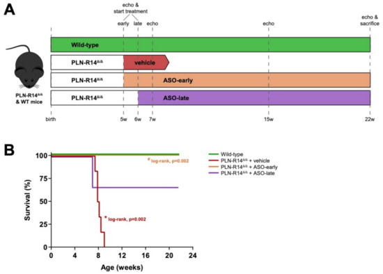 Figure 1. Schematic overview of the study design and survival curve. (A) PLN-R14 Δ/Δ mice were randomized to administration of PLN-ASO or vehicle (saline). PLN-ASO treatment was initiated at 5 or 6 weeks of age (ASO-early and ASO-late, respectively), when PLN-R14 Δ/Δ mice had developed moderate or severe heart failure, respectively. Heart function was determined using echocardiography at treatment start and at the age of 7, 15 and 22 weeks. Survival of PLN-R14 Δ/Δ mice was monitored up to 22 weeks of age, when all mice were sacrificed for histological and molecular tissue analyses. (B) Percentage survival of WT mice and PLN-R14 Δ/Δ mice receiving early or late PLN-ASO treatment or vehicle injections to a maximum of 22 weeks of age (n = 6 per group). * p < 0.05 vs. WT, # p < 0.05 vs. PLN-R14 Δ/Δ + vehicle (log-rank test).