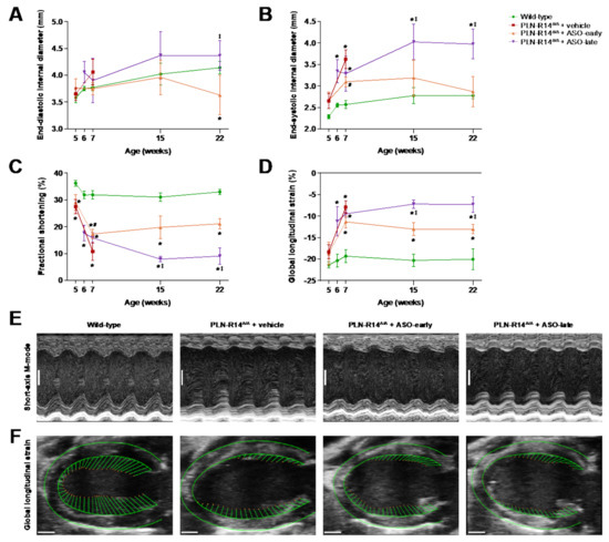 Figure 2. Heart failure progression was halted by PLN-ASO treatment. (A-D) Left-ventricular end-diastolic (A) and end-systolic (B) internal diameters, percentage fractional shortening (C) and percentage global longitudinal strain (D) at the age of 5, 6, 7, 15 or 22 weeks in WT mice and PLN-R14 Δ/Δ mice subjected to vehicle or early or late PLN-ASO administration (n = 6 per group, except n = 4 for 5-, 6- and 7-week-old WT mice and 7-, 15- and 22-week-old ASO-late mice). Data including individual values are shown in Figure S2. Data are shown as mean ± SD. * p < 0.05 vs. age-matched WT mice, # p < 0.05 vs. age-matched PLN-R14 Δ/Δ + vehicle, p < 0.05 vs. age-matched PLN-R14 Δ/Δ + ASO-early (two-way ANOVA followed by Tukey’s post hoc test). Data of 5- to 7-week-old WT mice are derived from Eijgenraam et al. [15]. (E) Images of short-axis M-mode recordings of 7-week-old WT mice and PLN-R14 Δ/Δ mice receiving vehicle or early or late PLN-ASO treatment, representative for the data shown in (AC) (scale bar: 1 mm). (F) Representative long-axis B-mode images of 7-week-old WT mice and PLN-R14 Δ/Δ mice receiving vehicle or early or late PLN-ASO treatment including left-ventricular epicardial and endocardial tracings with vectors indicating the direction and magnitude of wall motion, which is quantified in (D) (scale bar: 1 mm).