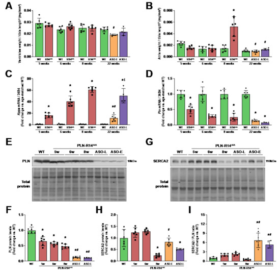 Figure 3. Congestive heart failure was inhibited by knockdown of PLN. (A,B) Biventricular (A) and atrial (B) weights of WT mice and vehicle-treated or early or late ASO-treated PLN-R14 Δ/Δ mice sacrificed at the age of 5, 6, 8 or 22 weeks, normalized for tibia length to the power 3. (C,D) Left-ventricular mRNA levels of Nppa (natriuretic peptide A; ANP) (C) and Pln (phospholamban; PLN) (D) normalized to housekeeping gene Rplp0 (ribosomal protein, large, P0; 36B4) mRNA levels in WT mice and vehicle-treated or early or late ASO-treated PLN-R14 Δ/Δ mice at the age of 5, 6, 8 or 22 weeks, shown as (log2) fold change compared to age-matched WT mice. (E) Left-ventricular PLN protein (upper panel) and total protein levels (lower panel) in WT mice and vehicle-treated or early or late ASO-treated PLN-R14 Δ/Δ mice at the age of 5, 6, 8 or 22 weeks. (F) PLN protein levels are normalized to total protein levels and quantified as fold change compared to WT mice. (G) Left-ventricular SERCA2 protein (upper panel) and total protein levels (lower panel) in WT mice and vehicle-treated or early or late ASO-treated PLN-R14 Δ/Δ mice at the age of 5, 6, 8 or 22 weeks. (H) SERCA2 protein levels are normalized to total protein levels and quantified as fold change compared to WT mice. (I) Ratio of SERCA2 over PLN protein levels, presented as fold change compared to WT mice. n = 6 per group, except n = 4 for PLN-R14 Δ/Δ + ASO-late. Full blot images are shown in Figure S4 and S5. Data are shown as mean ± SD. *p < 0.05 vs. (age-matched) WT mice, # p < 0.05 vs. 8-week-old PLN-R14 Δ/Δ + vehicle, p < 0.05 vs. PLN-R14 Δ/Δ + ASO-early (two-way ANOVA followed by Tukey’s post hoc test).