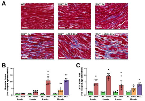 Figure 4. Myocardial fibrosis formation was attenuated upon PLN-ASO administration. (A,B) Representative images of Masson’s trichrome-stained cardiac tissue sections (scale bar: 70 μm) (A) and quantification of myocardial fibrosis in WT mice and vehicle-treated or early or late ASO-treated PLN-R14 Δ/Δ mice at the age of 5, 6, 8 or 22 weeks, depicted as fold change compared to age-matched WT mice (B). (C) Left-ventricular mRNA levels of Col1a1 (collagen, type I, alpha I; COL1A1) normalized to housekeeping gene Rplp0 (36B4) mRNA levels in WT mice and vehicle-treated or early or late ASO-treated PLN-R14 Δ/Δ mice at the age of 5, 6, 8 or 22 weeks, shown as fold change compared to age-matched WT mice. n = 6 per group, except n = 4 for PLN-R14 Δ/Δ + ASO-late. Data are shown as mean ± SD. * p < 0.05 vs. age-matched WT mice, # p < 0.05 vs. 8-week-old PLN-R14 Δ/Δ + vehicle, p < 0.05 vs. PLN-R14 Δ/Δ + ASO-early (two-way ANOVA and Tukey’s post hoc test).