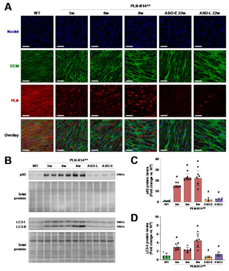 Figure 5. PLN protein aggregates were eliminated by PLN-ASO therapy. (A) Representative fluorescence images of WT mice and vehicle-treated or early or late ASO-treated PLN-R14 Δ/Δ mice at the age of 5, 6, 8 or 22 weeks stained for nuclei (DAPI) in blue (top), extracellular matrix (WGA) in green (second), PLN in red (third) and an overlay of all channels (bottom) (scale bar: 70 μm). (B) Left-ventricular p62/sequestome 1 (SQSTM1), microtubule-associated protein 1A/1B-light chain 3 (LC3) and corresponding total protein levels in WT mice and vehicle-treated or early or late ASO-treated PLN-R14 Δ/Δ mice sacrificed at the age of 5, 6, 8 or 22 weeks. (C,D) p62 (C) and LC3-II (D) protein levels are normalized to total protein levels and quantified as fold change compared to WT mice (n = 6 per group, except n = 4 for PLN-R14 Δ/Δ + ASO-late). Full blot images are shown in Figure S6 and S7. Data are shown as mean ± SD. * p < 0.05 vs. WT mice, # p < 0.05 vs. 8-week-old PLN-R14 Δ/Δ + vehicle (two-way ANOVA followed by Tukey’s post hoc test).